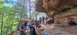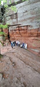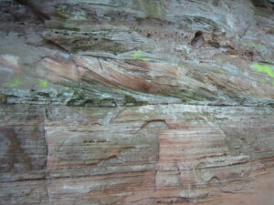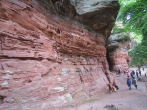 Concernant l’aspect géologique, le chemin permet d’accéder à différents horizons stratigraphiques de la formation du Grès vosgien qui se développe sous la forme d’une falaise pouvant atteindre 20 mètres. Les objets naturels visibles sur les affleurements ont permis des discussions autour de deux points principaux : (i) des notions de géologie fondamentale (stratigraphie, sédimentologie de faciès, pétrophysique), et (ii) des orientations en termes de transition énergétique avec l’utilisation éventuelle du Grès vosgien pour la géothermie, le stockage potentiel de CO2 à partir d’analogues de terrain comme celui-ci (dimensionnement des réservoirs, degré de connectivité latérale et verticale, caractérisation et gestion des hétérogénéités naturelles).
