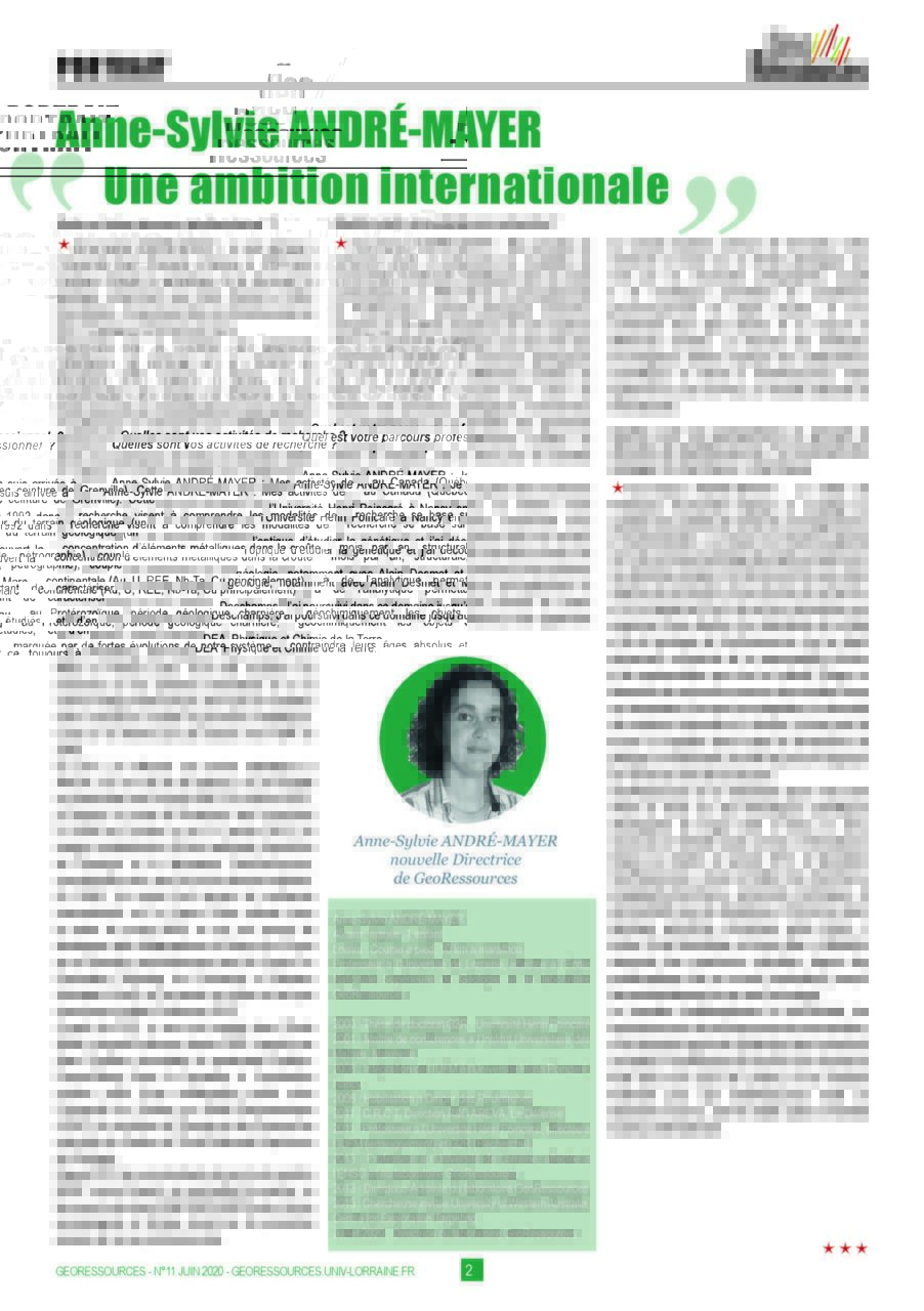 Anne-Sylvie ANDRÉ-MAYER, professeur en métallogénie à l’ENSG, est la nouvelle directrice du laboratoire GeoRessources. Élue par le conseil de laboratoire, elle a pris ses fonctions le 1er juillet 2020 et succède à Jacques PIRONON qui occupait ce poste depuis la création du laboratoire en 2013.