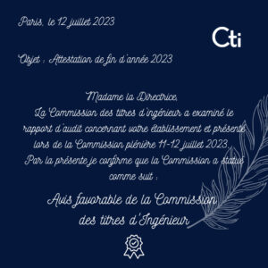 La Commission des titres d’ingénieur, après examination du rapport d’audit préparé par nos soins et sa présentation en Commission plénière le 11 et 12 juillet derniers, a statué un avis favorable :