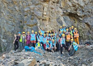 La photo de groupe a été prise dans la carrière du Rivet, secteur de Réalmont devant un filon minéralisé en Pb-Zn lors de la journée collective de début de stage. Merci à l’entreprise BESSAC TPC qui nous y accueille chaque année 🤝