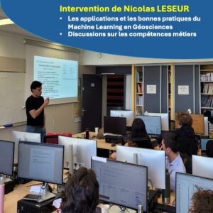 Ce cours introduit et organisé par Adel ABDALLAH, a permis de présenter l’histoire, les méthodes, les enjeux et les défis de l’IA et du Machine Learning en général, et plus spécifiquement dans le domaine des géosciences. Les élèves-ingénieurs ont pu bénéficier des interventions remarquables de Nicolas Leseur et de Khaled Hallak, agrémentées d’exercices pratiques et de discussions ouvertes sur les métiers et les compétences de la data. Ils ont enfin planché sur un projet, pour mettre en application ce qu’il ont appris.