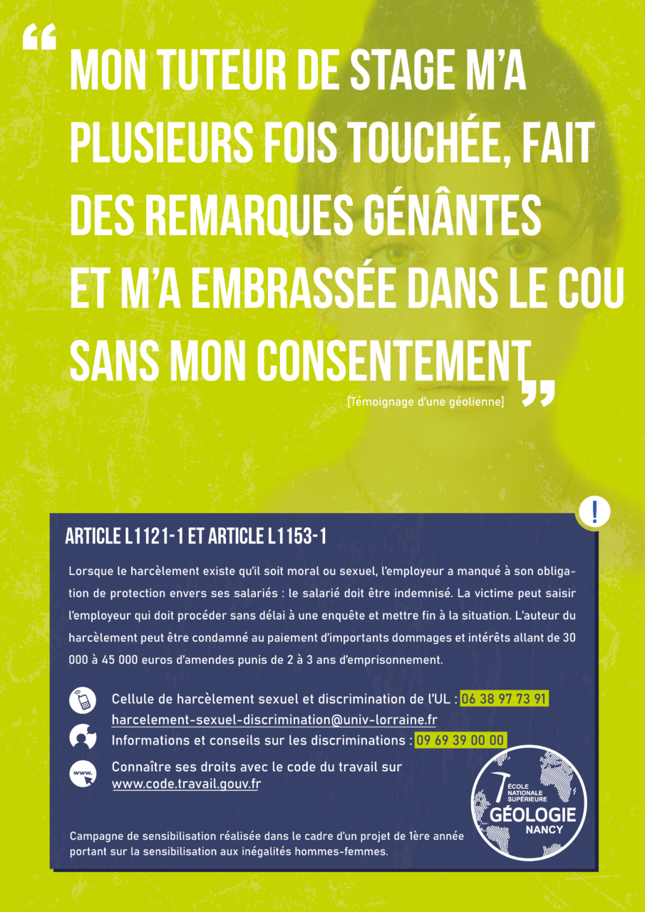 Programmée pour être lancée le 25 novembre, journée internationale de Lutte contre les violences sexistes et sexuelles, cette campagne a pu être déployée dans les locaux de l’ENSG lors de la reprise partielle des enseignements en présentiel pour les Travaux Pratiques.