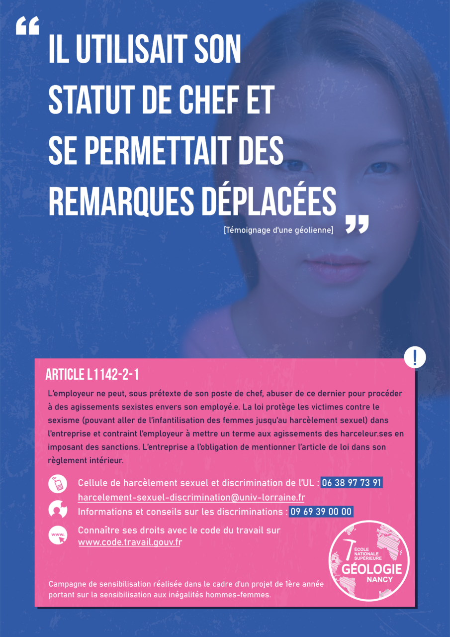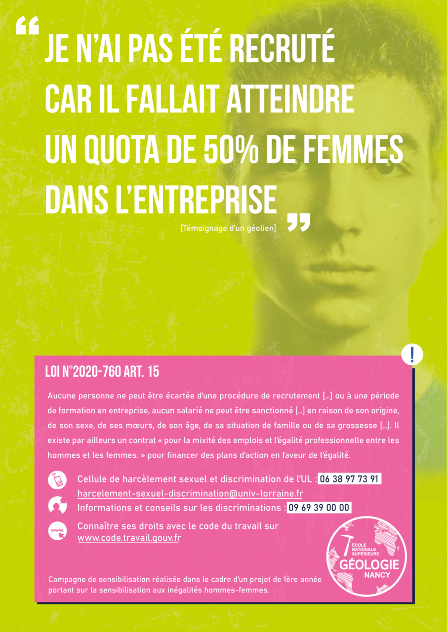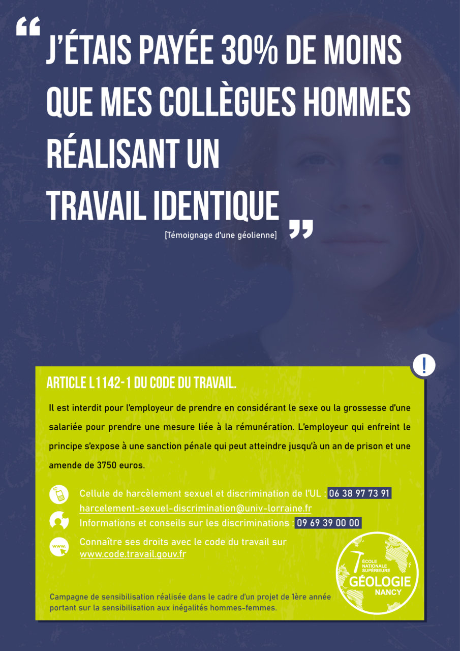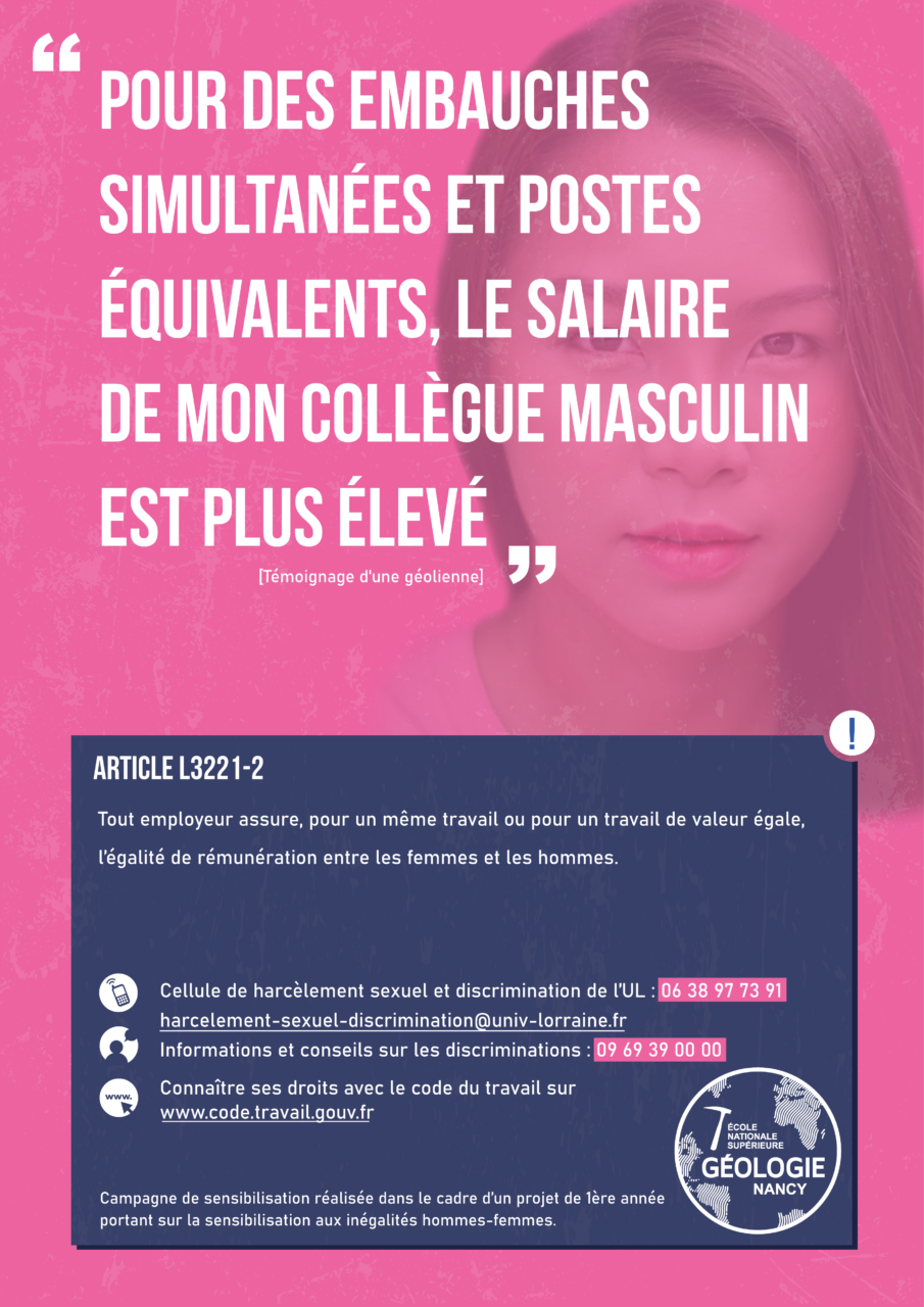 Dans le cadre du module « Gestion de projet » intitulé « État des lieux et développement d’actions pour l’égalité des genres à l’ENSG et après », un groupe d’élèves* a réalisé une campagne d’affichage pour sensibiliser étudiant.e.s et personnels de l’école à ces sujets.