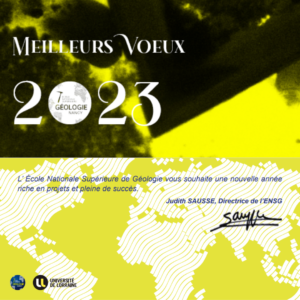 Meilleurs vœux 2023 ! 13/01/2023 Judith SAUSSE, directrice de l’École Nationale Supérieure de Géologie, le conseil d’École, l’équipe de direction et l’ensemble des personnels vous souhaitent une année riche en projets. Ensemble nous ferons de 2023 une année couronnée de succès
